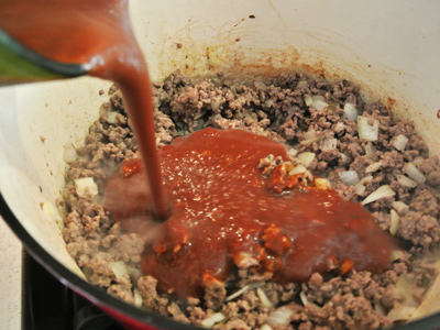 Pour the NM red chile sauce (about 2 cups) into the ground beef mix.