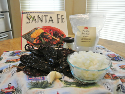 My red chile sauce is adapted from “The Food of Santa Fe”.  It has the best recipes for all traditional NM food. The red chile starts with 12 dried New Mexico red chiles, a medium chopped onion, 2 cloves garlic, a teaspoon Mexican oregano, water and salt to taste.