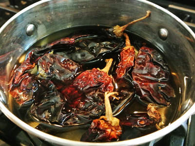 Cover the chiles with hot water and allow them to steep for 20 minutes.  Remove from pan but reserve water.  Strain the water and add 2 teaspoons “Better than Bouillon” Chicken Base.  Set aside.