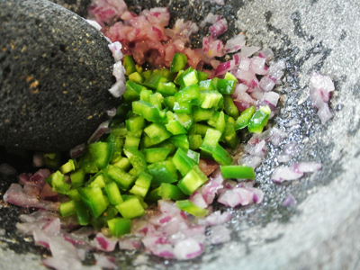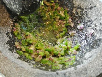 Use the tejelote to grind the pieces of garlic until it is mashed into a paste or you may want to leave a few bits behind, it’s up to you.