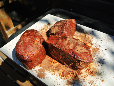 First comes the rub. After several attempts on the amounts of each ingredients I finally came up with a good tasting rub. It’s about double what you need so I will scale it down for you. You will need cocoa powder, Ancho chile, Espresso powder, brown sugar, salt and pepper.