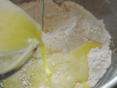 Pour the milk mixture into the flour mix and stir until a rough dough starts to form.