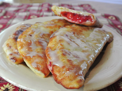 Add approximately 2 spoonfuls of cherry filling to the center of each of the rolled dough circles. Wet the outer edges of the dough with your finger so that it will seal. Fold the dough over the filling and pinch the edges together with your fingers to seal.