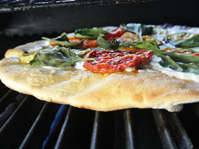 Lay the roasted tomato slices on top. Put the lid down on the grill and let cook 2 – 3 minutes more. At this point you can place the basil leaves on top or wait until the pizza has baked before adding fresh leaves.