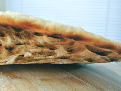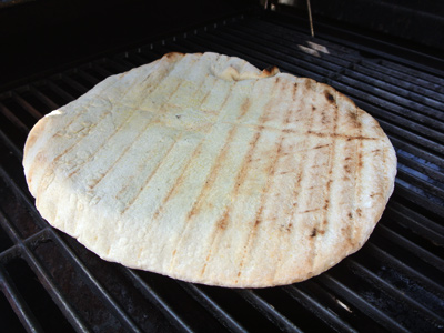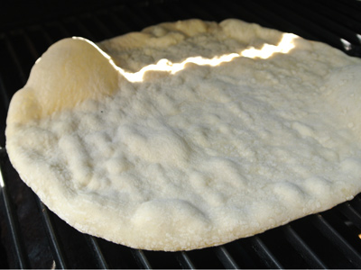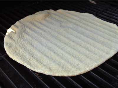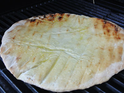 After about 3 – 4 minutes the dough should be slightly grilled on the bottom, flip the dough over and start adding the topping.