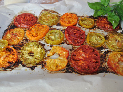 Slice heirloom tomatoes and place on a baking sheet lined with parchment paper. Salt and pepper the tomato slices and sprinkle with grated parmesan cheese. Place tomatoes in a preheated 425 degree oven for approximately 40 minutes or until they begin to caramelize around the edges.