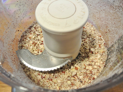 Starting with the crust, add 1/2 cup almonds to a food processor and mix until finely chopped.