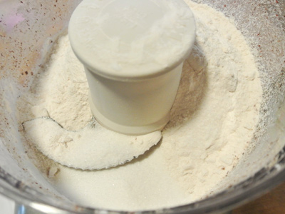 When the almonds are all chopped, add the flour, sugar and salt. Pulse a few times to mix together.