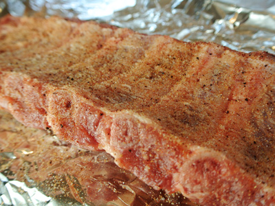 I found a recipe for Oklahoma Joe’s Rib Rub online at Midwest Living Magazine. I can’t find when it was posted but it is my go to rib rub. Sprinkle a generous amount of the rib rub over the back side of the ribs.