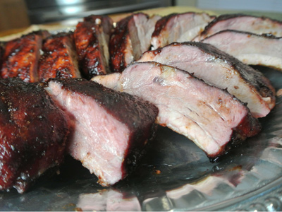 When the coals are hot and ready, fill the smoke box with the soaked wood chips and add the liquid to the insert box. Place the box on the opposite side of where the meat smokes. Pour the hot coals near the smoke box and close the lid. Adjust your side vents and top vents to regulate the temperature to 225 degrees. Set the ribs on the opposite side of the coals and close the lid. Monitor the ribs every half hour to check the temperature and add more coals if the temp reduces to below 200 degrees. If the temperature raises to over 300 degrees adjust the side vents so that less air can fuel the coals. The ribs should smoke for 3 1/2 to 4 1/2 hours. Check the ribs by picking them up with tongs. If they begin to crack when bent they are ready. You can also use a meat thermometer to check as well.