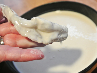 The next bowl has the batter which includes flour, sugar, salt, milk and rum. Dip the floured shrimp into the batter.