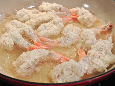 Pat the shrimp dry with a paper towel to absorb any excess liquid. Slice through the top of each shrimp so that you can spread the shrimp open (butterflied). Dredge each shrimp first in the flour, then dip in the batter and finally coat with the panko/coconut mixture. Arrange the shrimp on a plate until all the shrimp have been battered and coated.