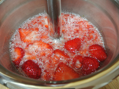 I used my hand blender to blend the strawberries until smooth. I find the hand mixer makes less mess than scraping down the sides of a traditional blender.