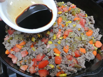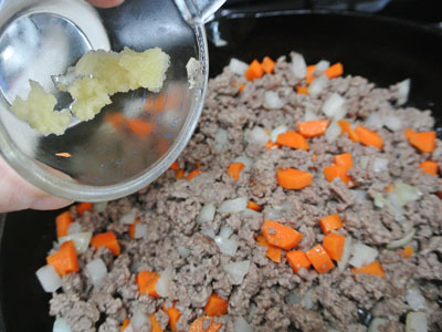 Brown 1 pound of ground beef in a 10 inch cast iron skillet over medium high heat.  When cooked through, drain any excess grease.  Add diced carrot and onion to the pan and saute over medium heat.
