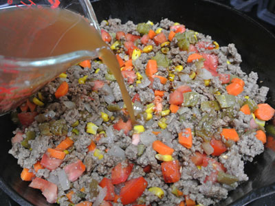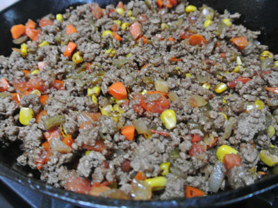 Brown ground beef over medium high heat in a 10 inch cast iron skillet.  When browned, drain any excess grease. Add diced carrots and onions to the skillet and let the vegetables simmer over medium heat until they soften.  Add the grated garlic and cook for about 1 minute, just until it becomes fragrant.  Add diced green chile and tomato to the mix along with the roasted corn.  Stir to blend everything together, then add the beef broth and worcestershire sauce.  Bring to a simmer and let cook until the liquids have evaporated.