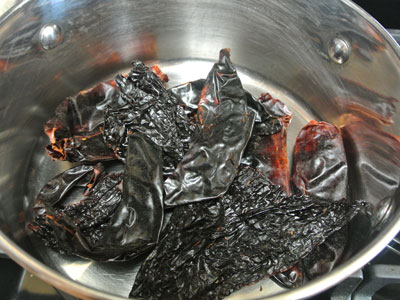 Remove stems and seeds from dried chiles. Place in a pot with enough water to cover chiles and bring to a boil. Turn off the heat and place a lid on top to steep the chiles for approximately 30 minutes.