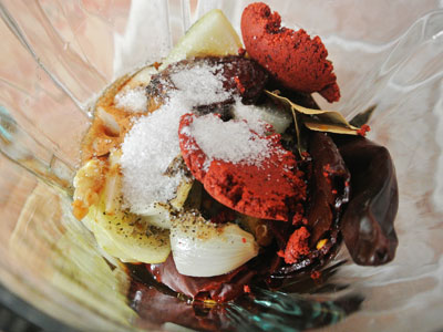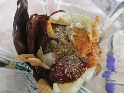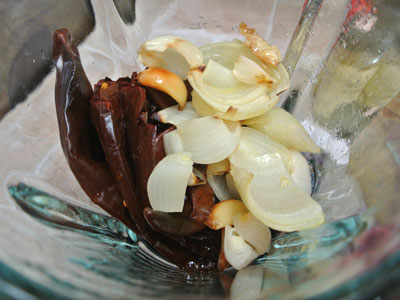 Strain the steeped chiles, reserving the liquid. Place chiles, roasted onions and garlic into a blender.
