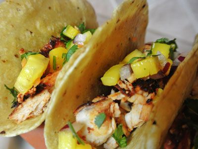 Fill warm corn tortillas with chicken and top with Pineapple Mango Salsa.