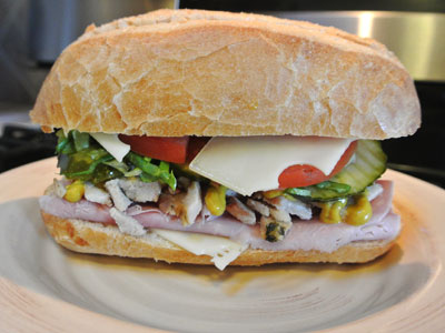 The bread used at the Cuban Coffee Queen was a crusty french roll similar to a bolillo roll. Bolillos originated in Mexico and Central America and are similar to a crisp mini baguette. They are fairly easy to find, usually in the deli or bakery area of your local grocer. First up is the Cuban Mix; slice the bolillo roll in half and place swiss or provolone cheese slices to cover both sides of the bread. Place two slices of ham on each sandwich. Take approximately 1/4 of the Mojo pork and lay on top of the ham.