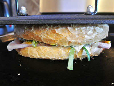 Heat a cast-iron skillet or griddle to medium high heat. Place the sandwich on the heated griddle and place a weighted press on top. Press the sandwich down to about half it’s original size. When it begins to brown nicely on the bottom, turn the sandwich over to heat the other side.