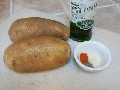 Peel, rinse and slice potatoes.  Place all your cut fries in a microwave safe bowl and drizzle with olive oil.  Place in the microwave and make sure to place a cover over top so that they will steam.  Cook in intervals of 2 minutes per potato.  I always cook on high 2 minutes, then toss them around and continue cooking another 2 minutes.