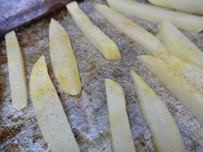 Spray cooking spray on a baking sheet.  Place the fries in a single layer leaving a bit of space in between each one.  They may be starchy and sticky, so make sure they are separated.  Sprinkle fry seasoning over the cut fries and drizzle with olive oil.  Place in preheated 425 degree oven for 12 minutes.  Turn the fries over to bake the other side an additional 12 minutes.  The fries should look crisp on the outside.
