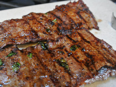 Preheat outdoor grill to 400 degrees. Grill steak approximately 2 – 3 minutes on each side depending on thickness of the steak.  *Skirt steak can be as thick as 1/2 inch or sometimes much thinner.  My steak was extremely thin and I cooked it 2 minutes on each side for a medium rare cut.  Use your judgement based on thickness and how well done you want the steak to be.