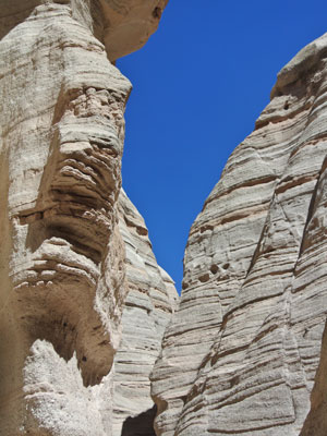 Kasha-Katuwe Tent Rocks National Monument is located just over an hour north of Albuquerque near the Cochiti Pueblo. Kasha-Katuwe meaning “white cliffs” is a natural formation of weathering and erosion that forms these rocks that resemble cones or tents. The slot canyon trail is approximately 1.5 miles one way and will climb in elevation to lookout over the canyon where you can view the tent rocks from above. The climb can be challenging at times but well worth the effort. The view from above is hard to describe as anything other than wonderous. Other than the wind, which is a given in NM, the weather was quite beautiful, low 70’s with mostly sunshine and blue skies. We took our time and tried to take in every moment and of course I took way too many pictures. Follow along on our tour from the bottom of the canyon to the top and back down again. Maybe you will be inspired to visit one day!