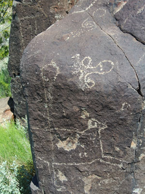 Three Rivers Petroglyph is located in the Southern Central part of New Mexico between Carrizozo and Tularosa. It is rare to find such a location where you can hike so close and walk among the rock carvings. There are many sites in New Mexico that have petroglyphs, in fact Joe and I live near several trails where you can hike and find many petroglyph drawings right here in Albuquerque. We enjoy getting out to walk the trails and are always excited to find something new that we’ve missed on a previous hike. Three Rivers is a treasure in that there are more than 20,000 known petroglyph drawings clustered in a this small area. You can see many of them along two trails that lead you through a 1 mile hike. It is one of the great wonders of the Southwest. Some of the drawings depict birds, humans, animals, fish, insects and plants, as well as numerous geometric and abstract designs. Some are faded and hard to make out what they are while others are still quite vivid and easy to determine what they were trying to convey. I’ve always loved to explore the petroglyphs and try to interpret the story native people left behind for us. We had a great day and made a large loop from Carrizozo to Tularosa and through Ruidoso Downs, and up to Hondo where we visted the Hondo Iris Farm. The drive takes you some of the most beautiful scenery of mountains and valleys. Hondo was our turn around point as we headed back north through Lincoln National Forest where Smokey the Bear was rescued in 1950 and now buried. For anyone who loves the history of the Southwest and Native American people who resided here, Three Rivers is an amazing place to visit.