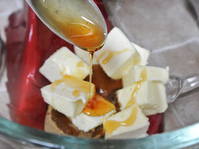 Combine the dark brown sugar, butter and honey in the bowl of a stand mixer.
