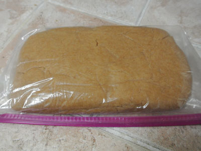Mix together the flour, baking soda, and salt together. Add about 1/3 of the flour mix at a time and mix on low just until blended. Continue adding in the dry mix until all has been incorporated. I found that the mix was too dry to stick together and added a tablespoon at a time (3 tablespoons total) of whole milk until the batter was easy to form. Transfer to a zip lock bag and press into a large rectangle.