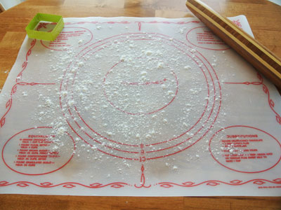 When rolled to approximately 1/8 inch thickness, cut squares and place on a baking sheet lined with parchment paper or a silicone baking mat. Leave 3/4 in space between cookies for expansion.