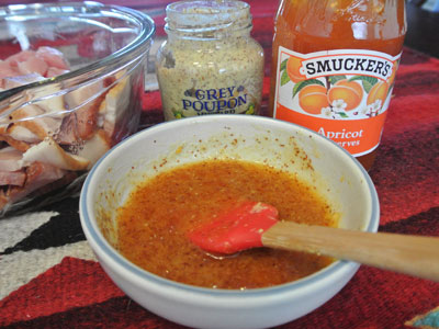 And now for the glaze . . . 3 parts apricot preserves to 1 part dijon mustard. Stir it together until it is well mixed. Simple and easy!