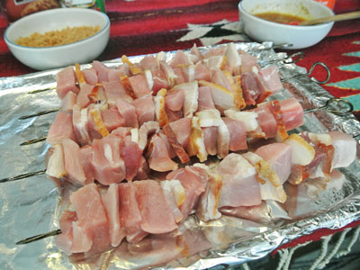 Skewer pork cubes and bacon pieces alternately. Sprinkle pork with creole seasoning and brown sugar rub on all sides. Place pork skewers on a preheated grill at 400 degrees. Turn pork every 4 – 5 minutes. Bacon will appear to char on the ends, if it starts to burn, turn down the heat. Pork should be cooked through in 15 – 18 minutes. Brush apricot glaze over pork during the last 2 minutes of grilling or immediately after you take it off the grill. Any leftover glaze can be used for dipping.