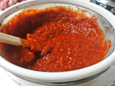 Pour the mixture into a strainer to trap all the excess seeds and chile peel.
