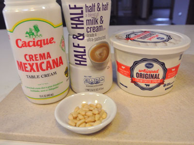 To make the sauce you’ll need Mexican table cream, half & half, whipped cream cheese and some pine nuts. Most recipes call for walnuts in the sauce but I thought pine nuts aka pinons are more my taste.