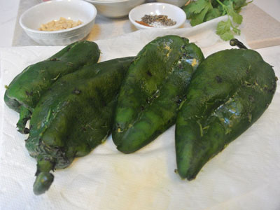 Once they are roasted, place in a plastic bag and let the chiles sweat it out for about 20 minutes or so. This helps release the peel.
