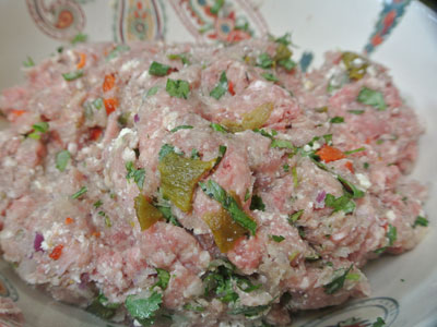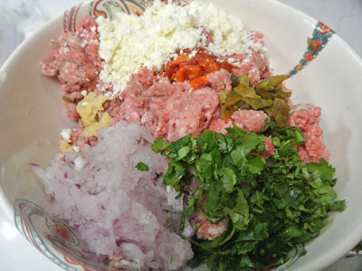 To the meat I added grated onion, garlic, salt, roasted red and roasted green chile, queso fresco cheese, and roughly chopped cilantro.