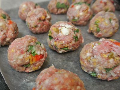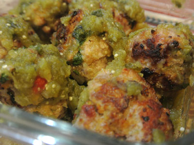 In a clean skillet layer as many meatballs as needed.  Spoon salsa over meatballs and bring just to a simmer.  Heat up for 2 – 3 minutes.  Serve meatballs over polenta, Spanish rice or fried potatoes.  Garnish with additional crumbled queso fresco cheese.