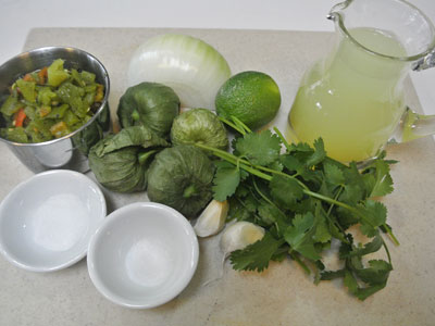 Time to make the salsa verde.  You will need diced green chiles, onion, garlic, tomatillos, cilantro, lime juice, salt, sugar and chicken broth.