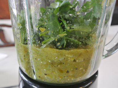 Once everything is blended, add the cilantro, lime juice and sugar.  Puree until mixed well.