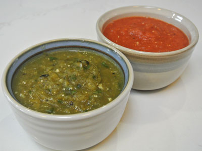 There is approximately 2 cups of salsa verde and 2 cups chile de arbol salsa.  Cover and set aside or refrigerate until meatballs are ready.