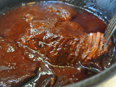 Take 2 forks and gently pull the roast apart. Add some of the reserved bbq sauce and mix well. Set aside