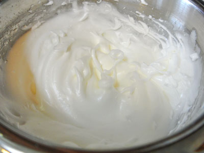 Clean your whisk attachments and beat the egg whites and salt together until they become foamy. Pour in the reserved 1/4 cup sugar and increase the speed as you whip the egg whites to medium peaks. Fold the egg whites into the mascarpone cream.