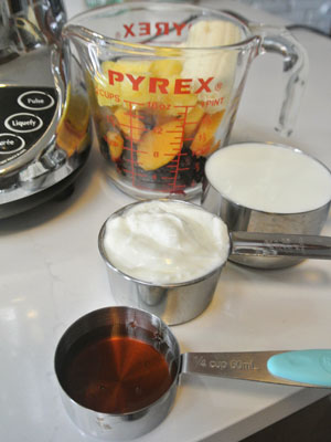 Pour 2 – 3 tablespoons of honey.  I usually use 2 tablespoons unless I am adding tart cherries, cranberries or sour citrus fruits.