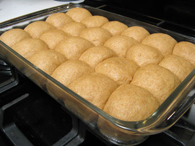 Punch down the dough and form into a ball. Pinch off a bit of dough, a little bigger than the size of a golf ball. Form the dough into a ball and place in a buttered 9 X 13 inch baking dish. You should have 24 rolls fit in the dish. Cover with a kitchen towel and let dough rise a second time, approximately 30 minutes to an hour.