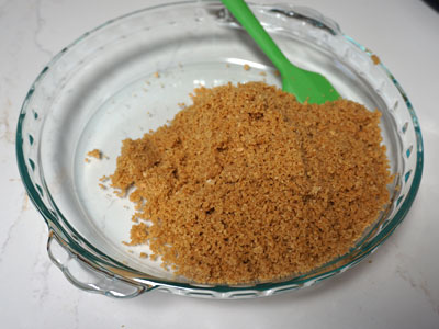 Pour the crumbs into a 9 inch pie plate and press down into the bottom and up the sides of the pie plate. Bake in a preheated 375 degree oven for 7 – 8 minutes. Allow pie crust to cool completely.
