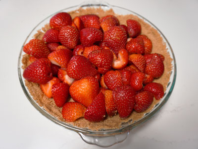 Place the strawberries into the cooled pie crust arranging so that they are evenly distributed throughout.