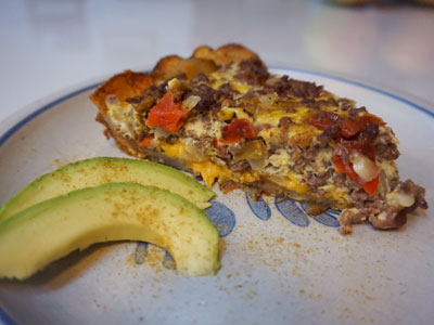 Begin layering the pie as follows: Add a layer of grated cheese over the potato slices in the cast iron skillet. Spoon the ground beef mixture over the cheese. In a medium bowl, whisk together the eggs and half & half. Pour the whisked eggs and milk evenly over the ground beef mixture. Bake in pre-heated 350 degree oven for 45 – 50 minutes or until a toothpick inserted comes out clean. Remove from oven and let cool for 5 minutes before serving.