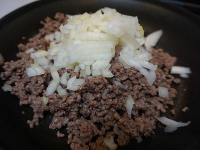 In the non-stick skillet that was used for the potatoes, brown the ground beef. Drain any excess oils from the ground beef and blot with a paper towel. Add the diced onion and saute with the ground beef until it is soft and translucent.